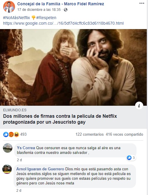 En su cuenta de Facebook el hasta hoy concejal Marco Fidel Ramírez pide boicotear a Netflix por la “Primera Tentación de Cristo”. Añade en su comentario #Respeten. Supongamos que si se llegase a permitir una censura de este tipo a nivel legal -poco probable que se dé en Colombia – Nada impediría que esos mismos censuradores pasaran a perseguir a los mormones porque creen que Jesús después de resucitado vino a América, o a los que no creen que el Jesús de los evangelios fue un personaje histórico. Pueden mirar a las teocracias de Irán o Arabia Saudita para darse cuenta a que niveles se llega cuando se les permite a los fanáticos religiosos tomar las riendas de un país. Pero sin duda esto no le importará al pastor y Concejal de la Censura, Marco Fidel Ramírez, que logró boicotear la presentación de la banda Marduk en octubre de 2018.